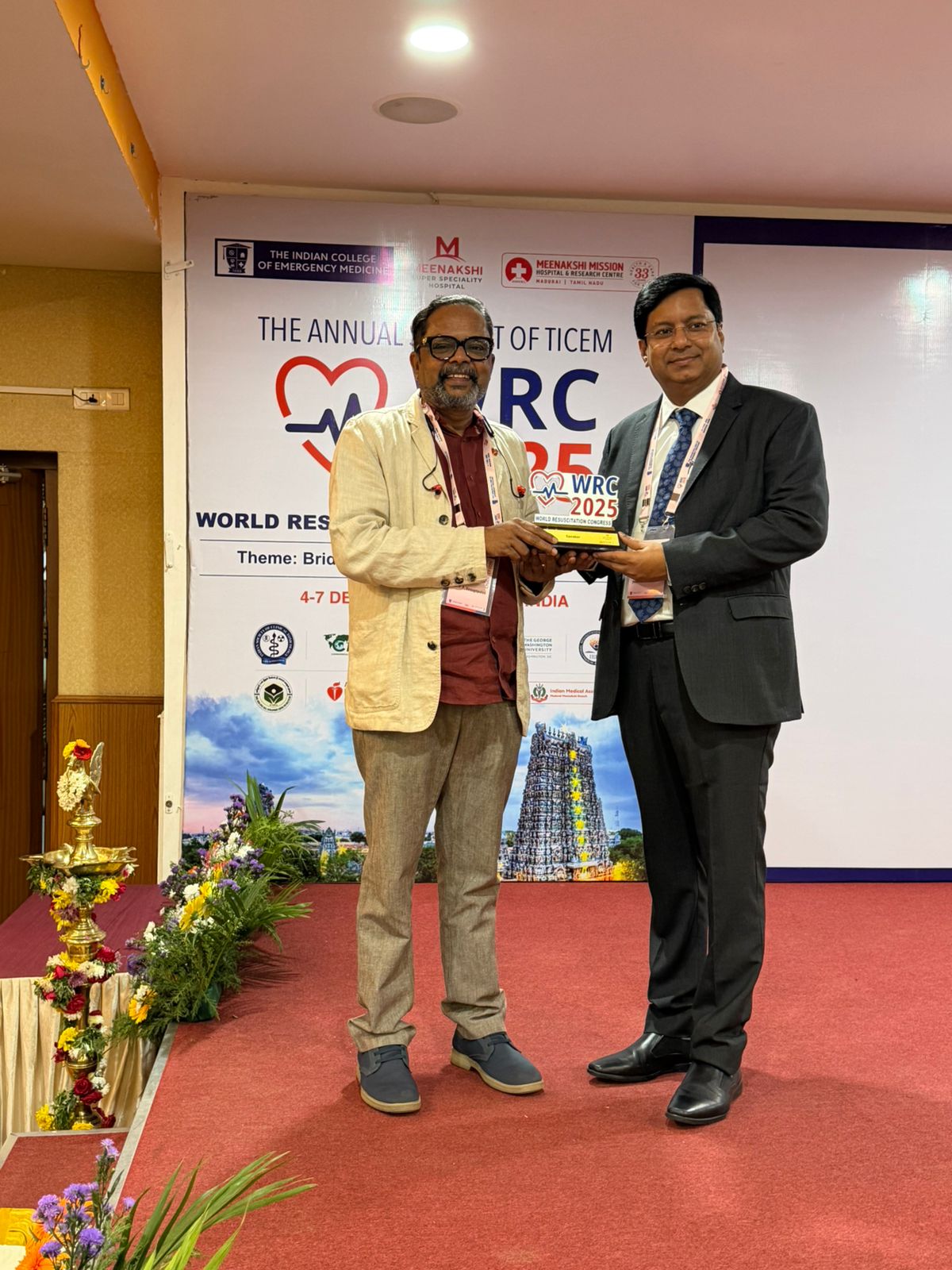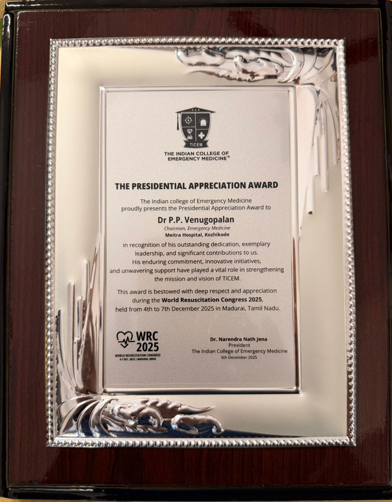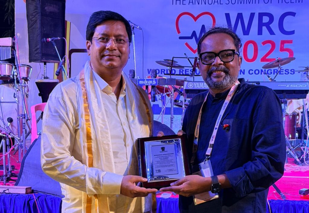 This esteemed recognition was formally presented by the Founder President of ICEM, Dr. Narendra Nath Jena, during the internationally renowned World Resuscitation Congress in Madurai on December 6, 2025.